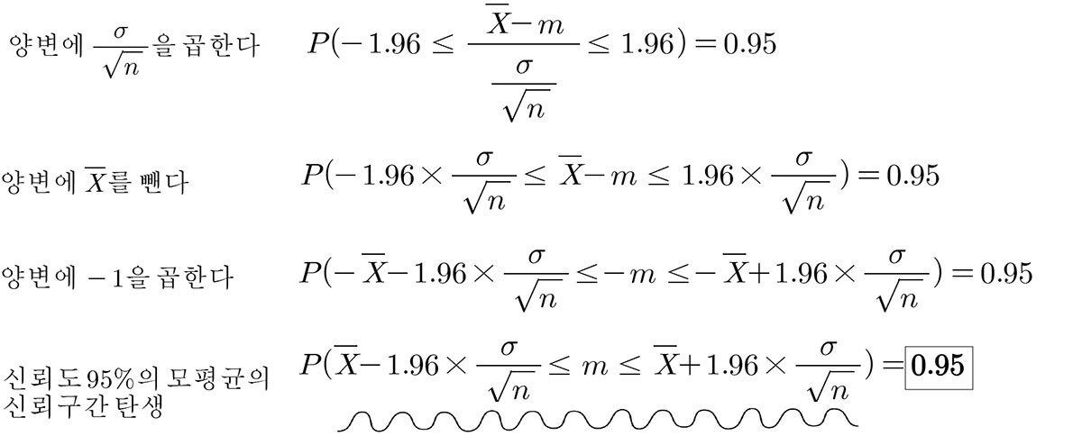 이 식에서 중요한 포인트는 모평균 m이 등장한다는 것이다. 이 식에서 모평균을 남겨두고 식을 변형하는 것이 포인트이다. 그게 바로 모평균 m이 95%이 확률로 속해질 범위 즉, 신뢰구간이 되는 것이다.