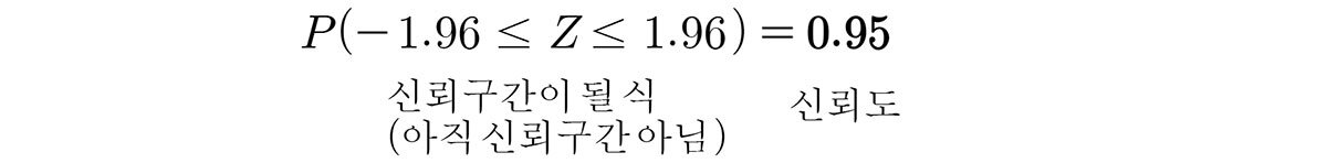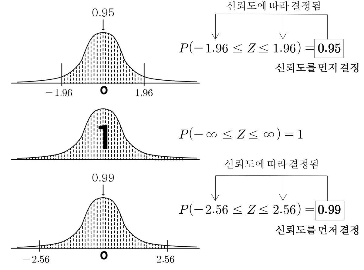 신뢰구간을 만드는 과정은 표준정규분포곡선에서 출발한다. 표준정규분포곡선 전체의 넓이는 1이며 1은 확률상 100%의 가능성을 의미한다. 그렇다면 95%의 가능성은 0.95의 넓이를 말한다. 이 넓이가 바로 신뢰도가 되며 신뢰도를 미리 ‘고정’시킨다.