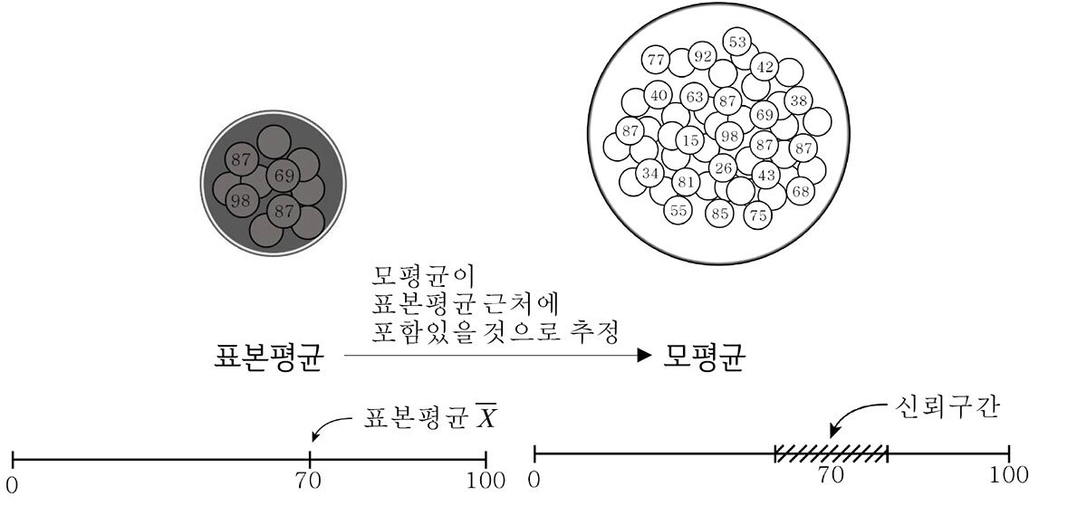 표본의 특성이 곧 모집단의 특성일 것임을 추정하며, 추정은 ‘구간’이나 ‘범위’로 가능하다. 표본의 평균을